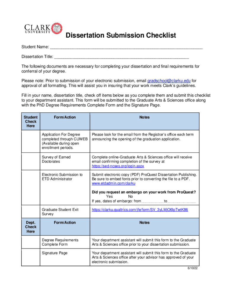 Dissertation Submission Checklist Student Name: ___ Dissertation Title: ___ The following documents are necessary for completing your dissertation and final requirements for conferral of your degree.