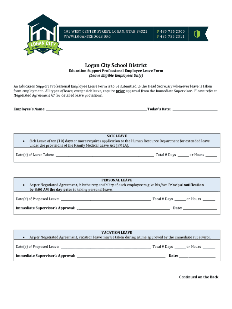 Logan City School DistrictEducation Support Professional Employee Leave Form (Leave Eligible Employees Only) An Education Support Professional Employee Leave Form is to be submitted to the Head Secretary