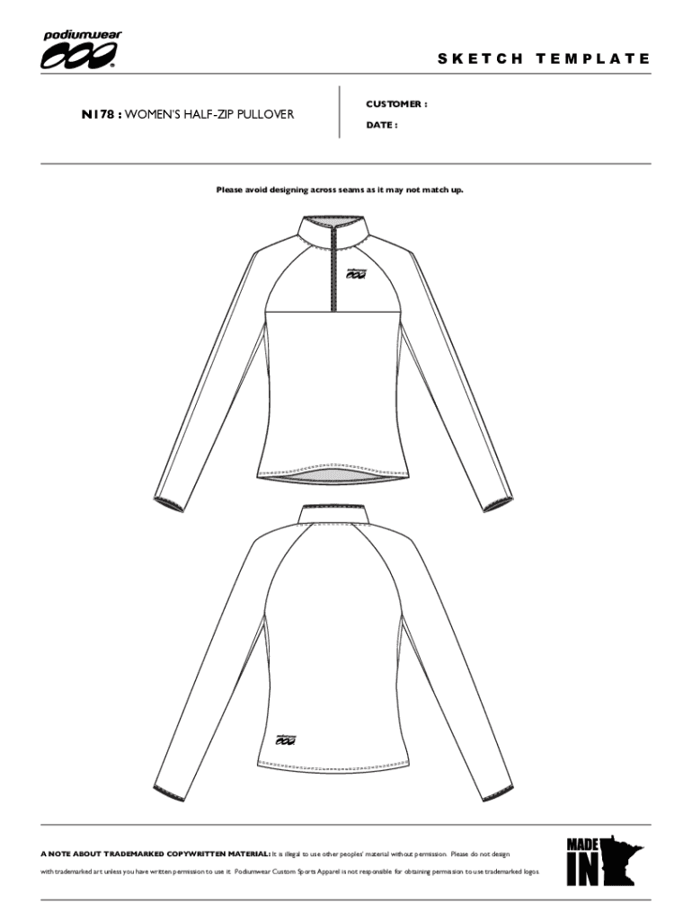SKETCH TEMPLATEN178 : WOMEN HALF ZIP PULLOVERCUSTOMER : DATE :Please avoid designing across seams as it may not match up. A NOTE ABOUT TRADEMARKED COPYWRITER MATERIAL: It is illegal to use other peoples