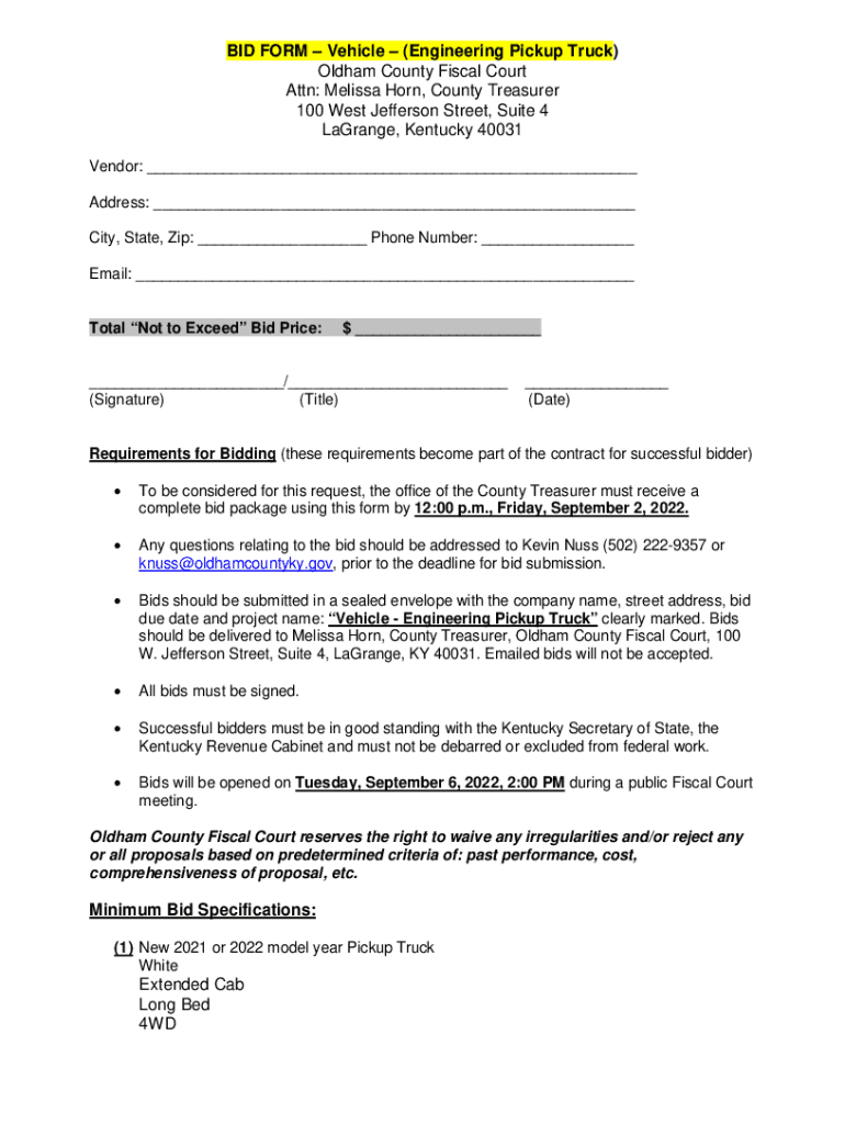 BID FORM Vehicle (Engineering Pickup Truck) Old ham County Fiscal Court Attn: Melissa Horn, County Treasurer 100 West Jefferson Street, Suite 4 LaGrange, Kentucky 40031 Vendor: ___ Address: ___ City,