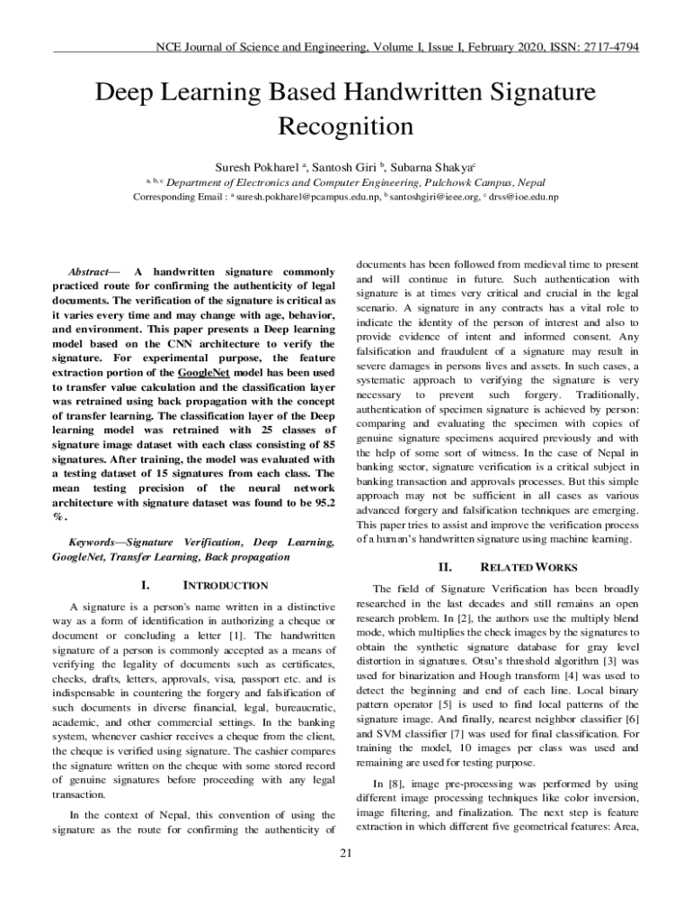 NCE Journal of Science and Engineering, Volume I, Issue I, February 2020, ISSN: 27174794Deep Learning Based Handwritten Signature Recognition Suresh Pearl a, Santosh Girl b, Subarea Shaky ac a, b,