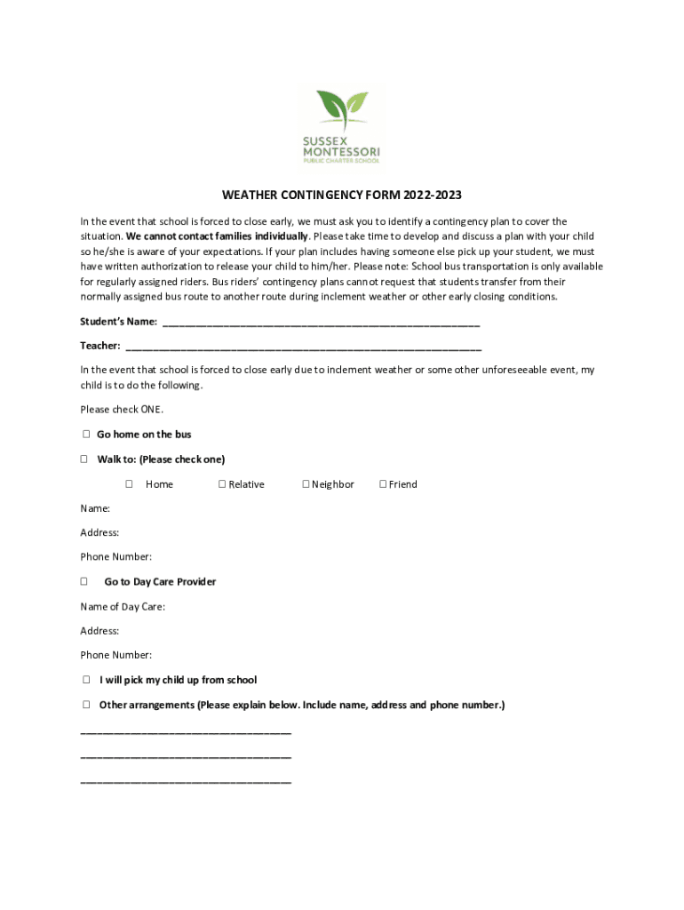 WEATHER CONTINGENCY FORM 20222023 In the event that school is forced to close early, we must ask you to identify a contingency plan to cover the situation. We cannot contact families individually.