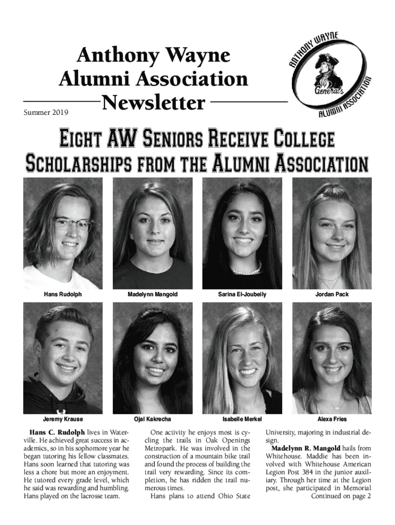 Anthony Wayne Alumni Association Newsletter Summer 2019Eight AW Seniors Receive College Scholarships from the Alumni Association Hans RudolphMadelynn MangoldSarina ElJoubeilyJordan Pack Jeremy KrauseOjal