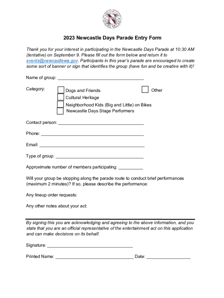 2023 Newcastle Days Parade Entry Form Thank you for your interest in participating in the Newcastle Days Parade at 10:30 AM (tentative) on September 9. Please fill out the form below and return it