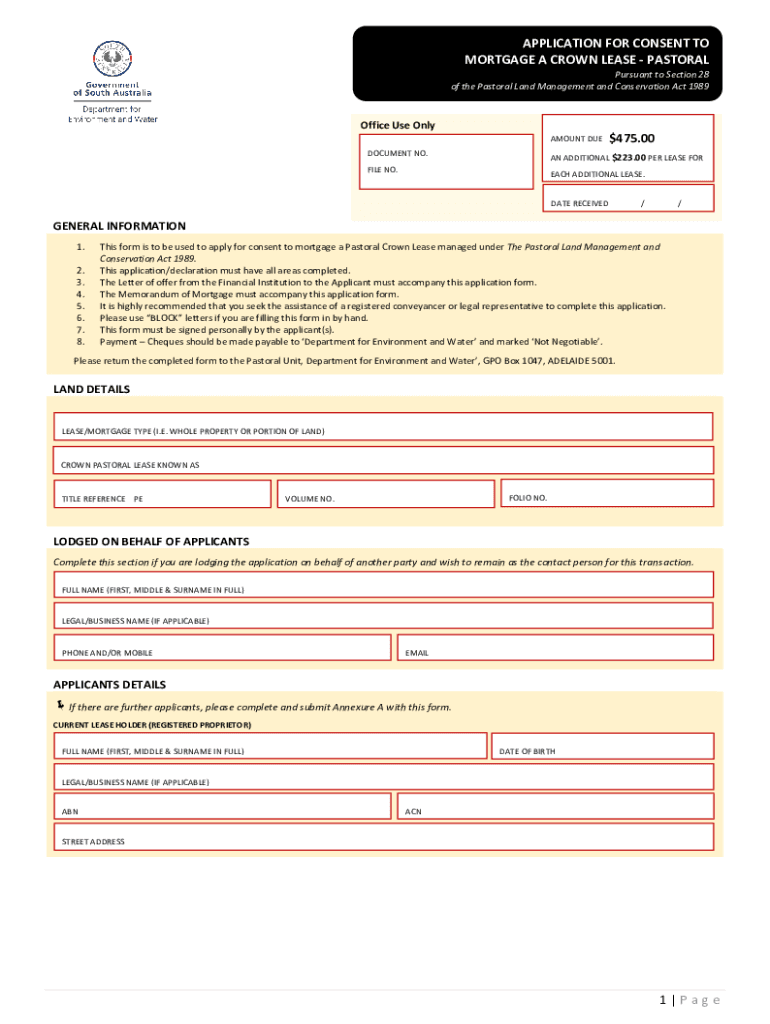 APPLICATION FOR CONSENT TO MORTGAGE A CROWN LEASE PASTORAL Pursuant to Section 28 of the Pastoral Land Management and Conservation Act 1989Office Use Only AMOUNT DUE DOCUMENT NO.$475.00AN ADDITIONAL