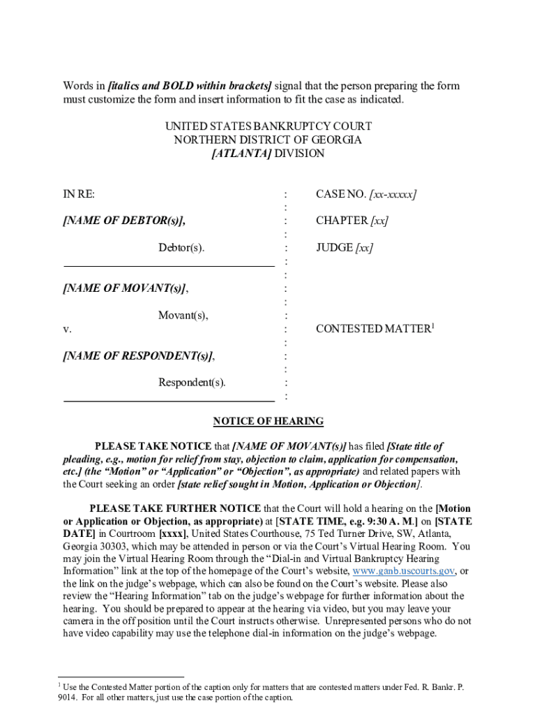 Words in [italics and BOLD within brackets] signal that the person preparing the form must customize the form and insert information to fit the case as indicated. UNITED STATES BANKRUPTCY COURT NORTHERN