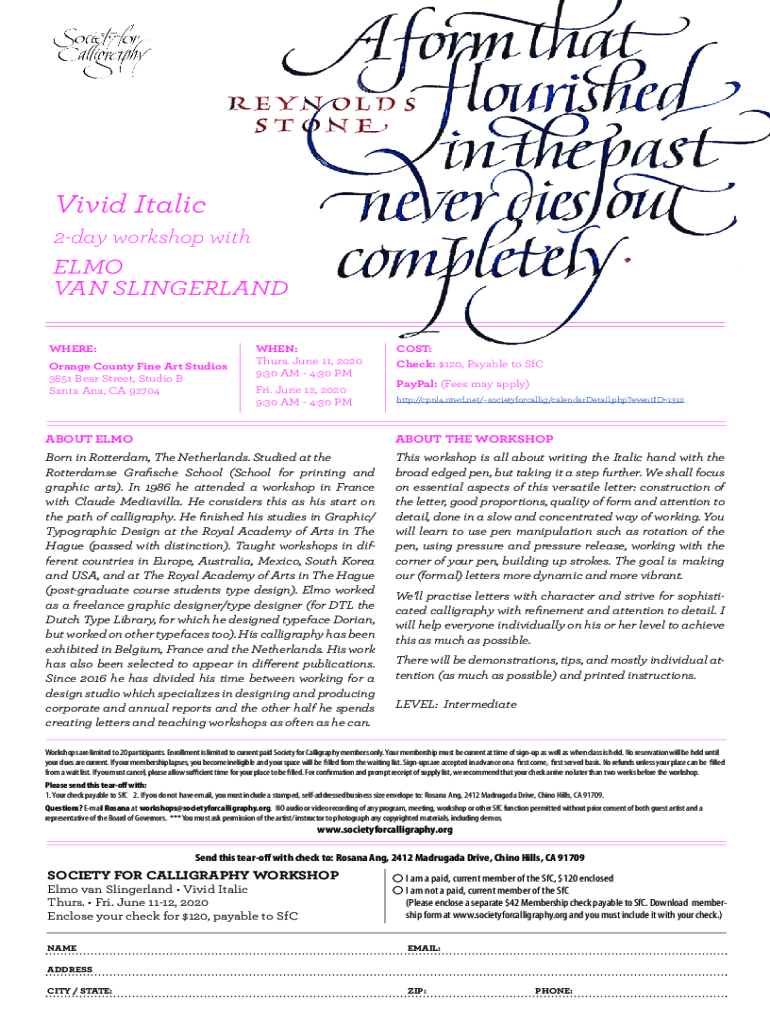 Vivid Italic 2day workshop Wilhelm VAN SWITZERLAND WHERE: Orange County Fine Art Studios 3851 Bear Street, Studio B Santa Ana, CA 92704WHEN: Thurs. June 11, 2020 9:30 AM 4:30 PM Fri. June 12, 2020