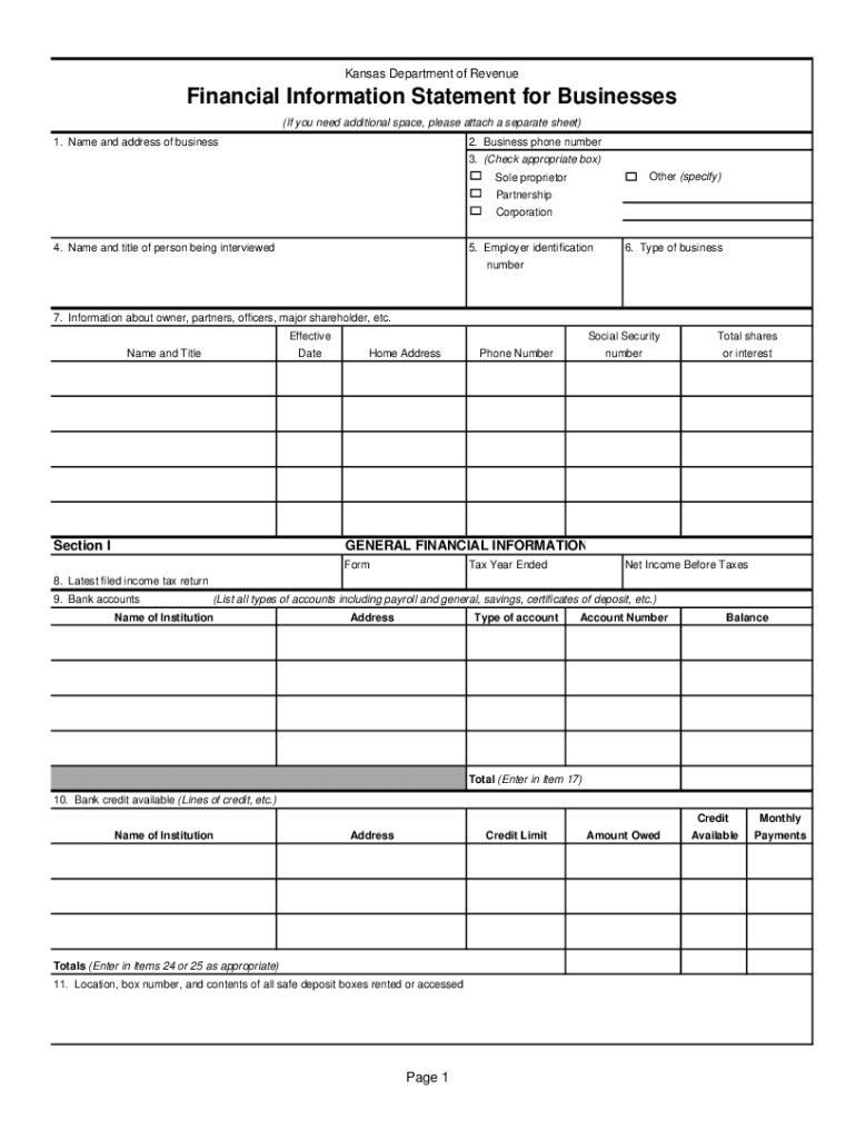 Kansas Department of RevenueFinancial Information Statement for Businesses (If you need additional space, please attach a separate sheet) 1. Name and address of business2. Business phone number 3.