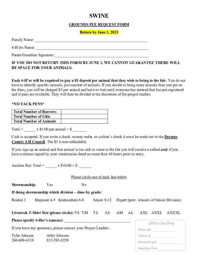 SWINE GROUNDS FEE REQUEST FORM Return by June 1, 2023, Family Name: ___ 4Hers Name: ___ Parent/Guardian Signature: ___ IF YOU DO NOT RETURN THIS FORM BY JUNE 1, WE CANNOT GUARANTEE THERE WILL BE SPACE