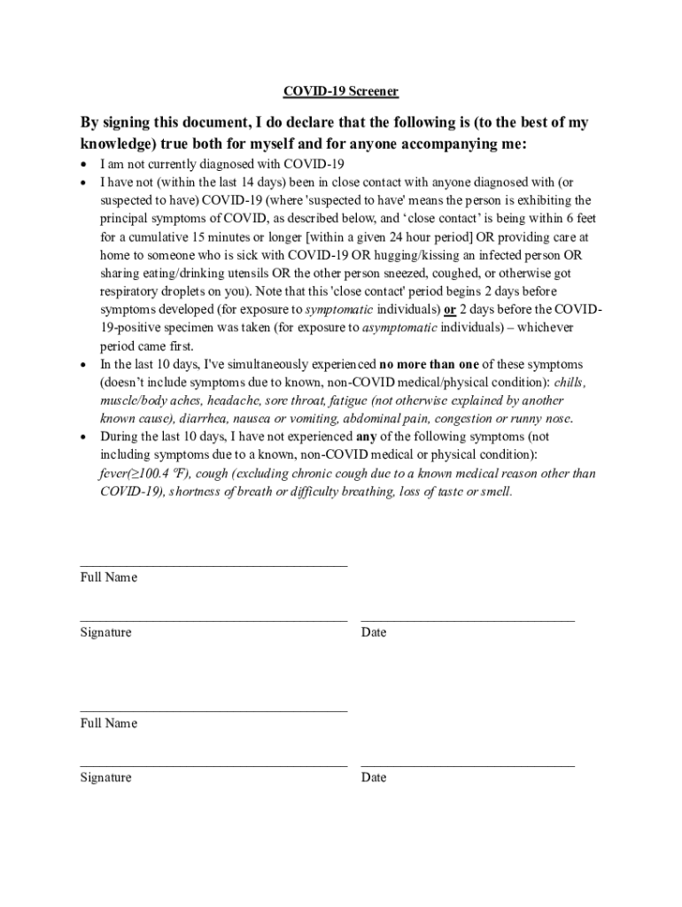 COVID-19 Screener signing this document, I do declare that the following is (to the best of my knowledge) true both for myself and for anyone accompanying me: I am not currently diagnosed with COVID-19