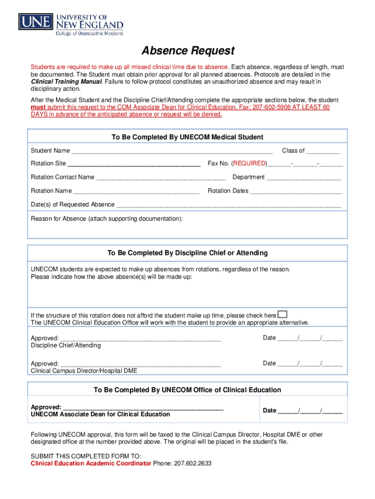 Absence Request Students are required to make up all missed clinical time due to absence. Each absence, regardless of length, must be documented. The Student must obtain prior approval for all planned