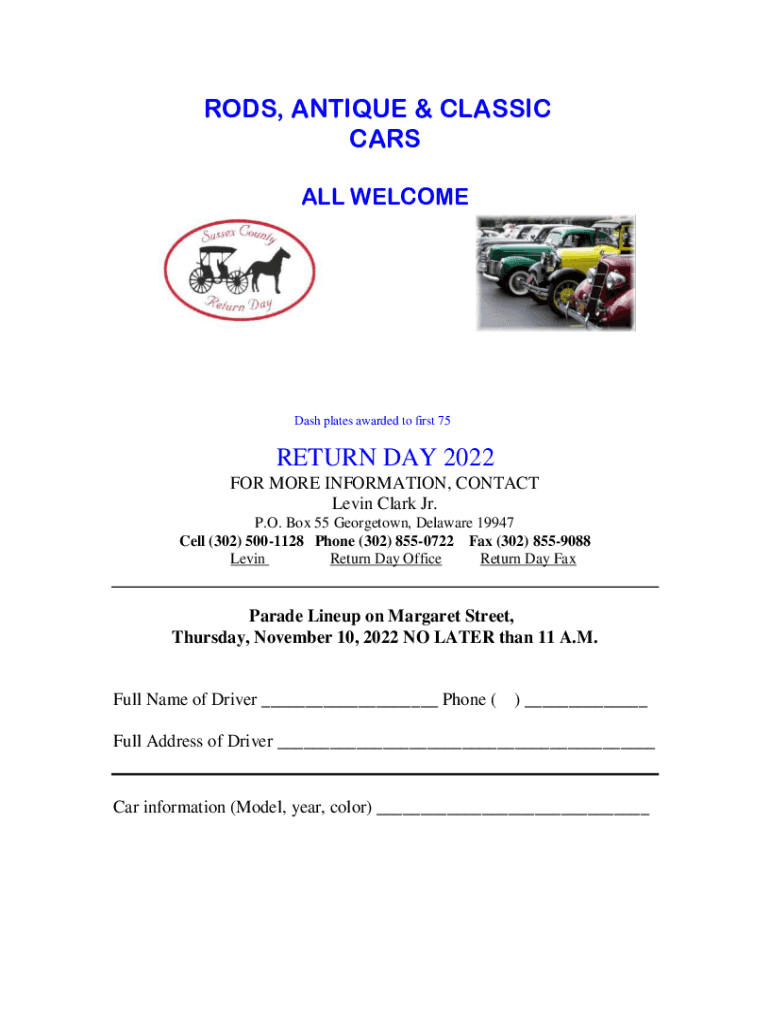 RODS, ANTIQUE & CLASSIC CARS ALL WELCOMED ash plates awarded to first 75RETURN DAY 2022 FOR MORE INFORMATION, CONTACT Kevin Clark Jr. P.O. Box 55 Georgetown, Delaware 19947 Cell (302) 5001128 Phone