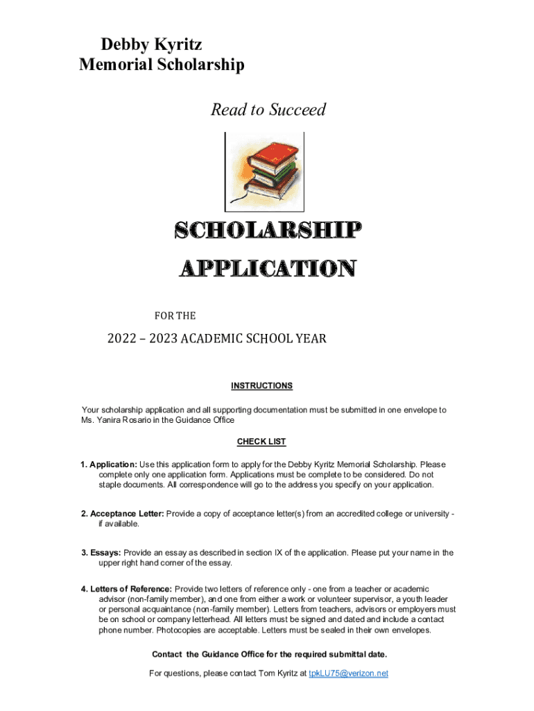 Debby Fritz Memorial Scholarship Read to SucceedSCHOLARSHIP APPLICATION FOR THE2022 2023 ACADEMIC SCHOOL YEAR INSTRUCTIONS Your scholarship application and all supporting documentation must be submitted