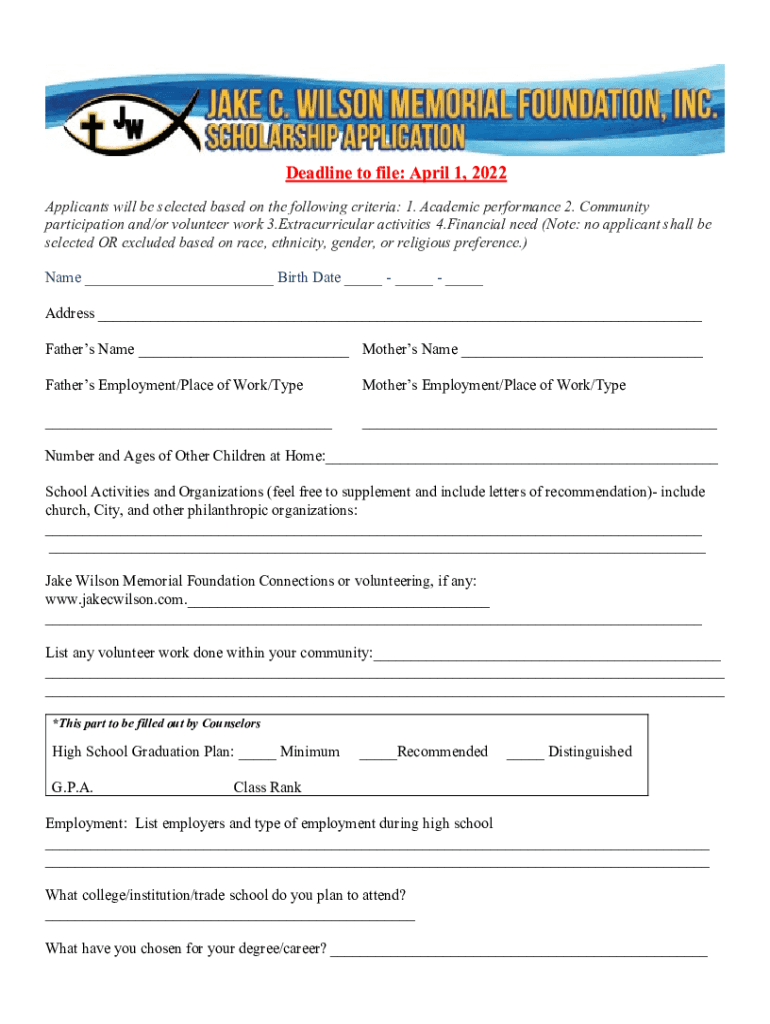 Deadline to file: April 1, 2022, Applicants will be selected based on the following criteria: 1. Academic performance 2. Community participation and/or volunteer work 3. Extracurricular activities