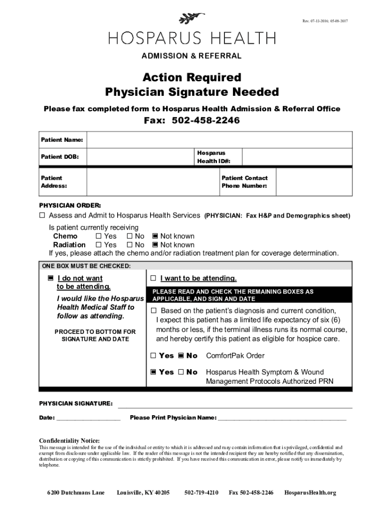 Rev. 07132016; 05092017ADMISSION & REFERRALAction Required Physician Signature Needed Please fax completed form to Bosporus Health Admission & Referral OfficeMax: 5024582246 Patient Name: Bosporus