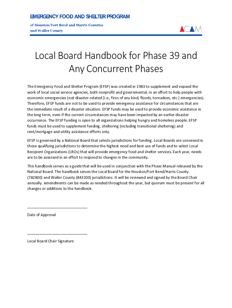 LocalBoardHandbookforPhase39and AnyConcurrentPhases TheEmergencyFoodandShelterProgram(ESP)wascreatedin1983tosupplementandexpandthe workoflocalsocialserviceagencies, bothnonprofitandgovernmental, inanefforttohelppeoplewith