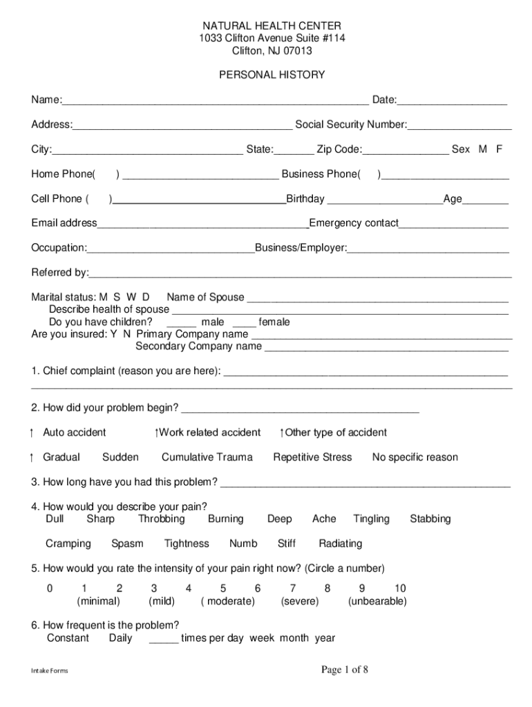 NATURAL HEALTH CENTER 1033 Clifton Avenue Suite #114 Clifton, NJ 07013 PERSONAL HISTORY Name:___ Date:___ Address:___ Social Security Number:___ City:___ State:___ Zip Code:___ Sex M F Home Phone()