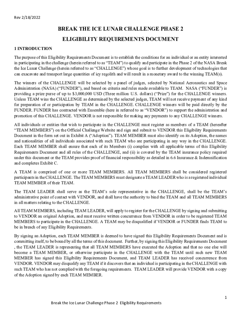 Rev 2/18/2022BREAK THE ICE LUNAR CHALLENGE PHASE 2 ELIGIBILITY REQUIREMENTS DOCUMENT 1 INTRODUCTION The purpose of this Eligibility Requirements Document is to establish the conditions for an individual