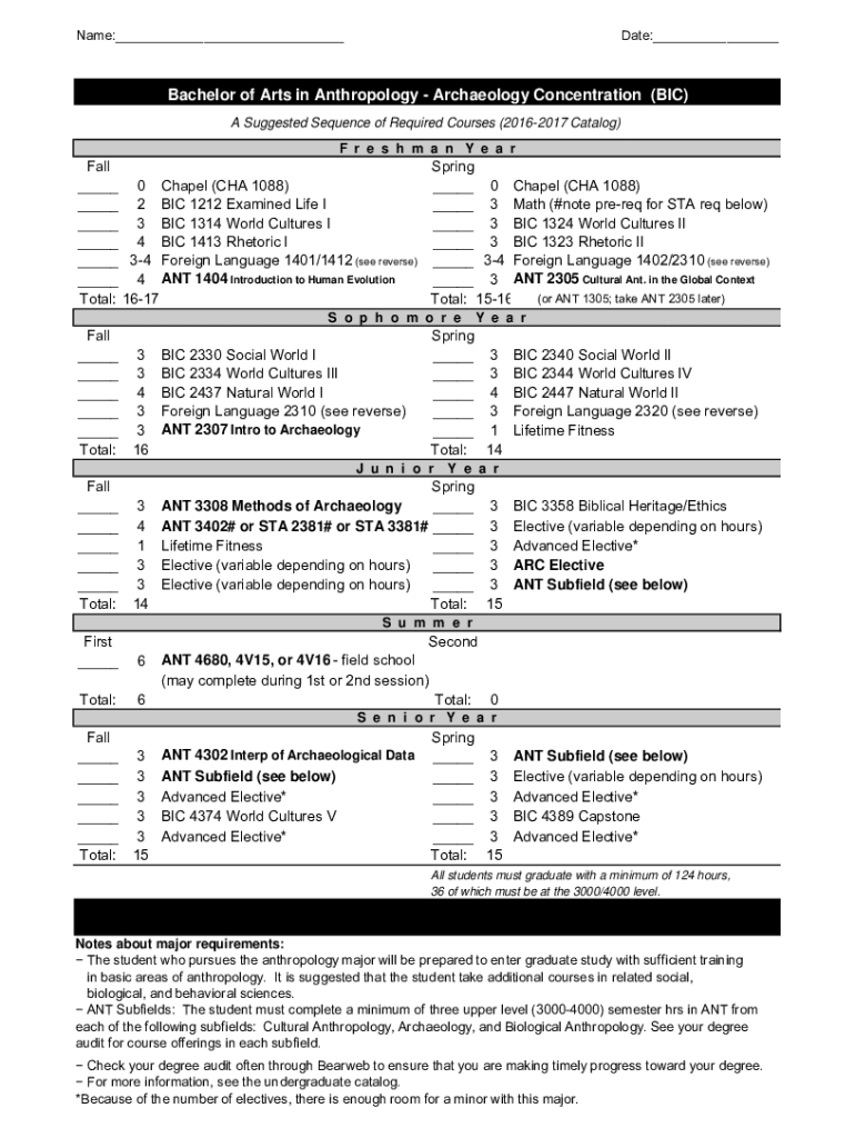 Name:___Date:___Bachelor of Arts in Anthropology Archaeology Concentration (BIC) A Suggested Sequence of Required Courses (20162017 Catalog) F r e s h m an n Y e a fall Spring ___ 0 Chapel (CIA 1088)