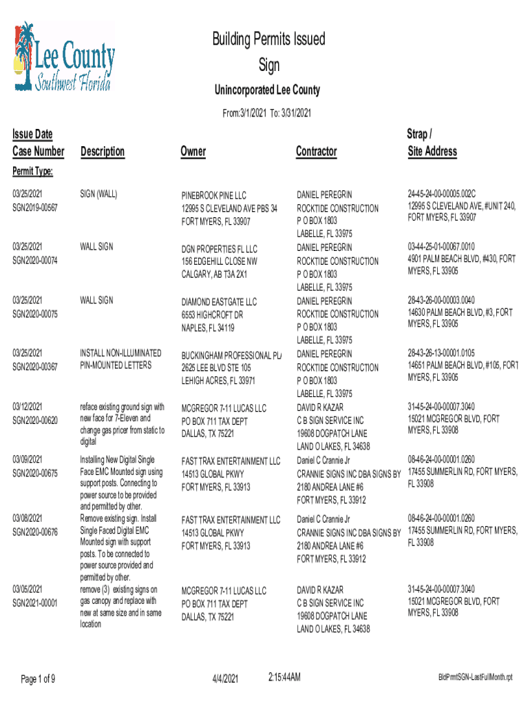 Building Permits Issued Sign Unincorporated Lee County From:3/1/2021 To: 3/31/2021Issue Date Case NumberDescriptionOwnerContractor03/25/2021 SGN201900567SIGN (WALL)PINEWOOD PINE LLC 12995 S CLEVELAND