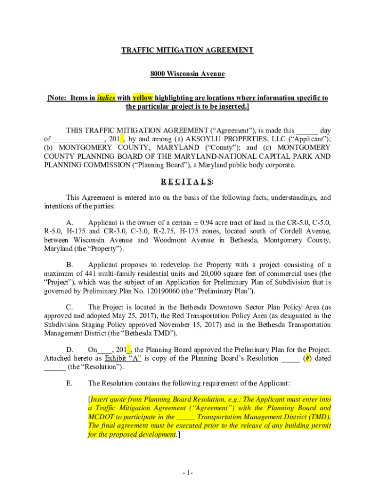 TRAFFIC MITIGATION AGREEMENT 8000 Wisconsin Avenue [Note: Items in italics with yellow highlighting are locations where information specific to the particular project is to be inserted.] THIS TRAFFIC