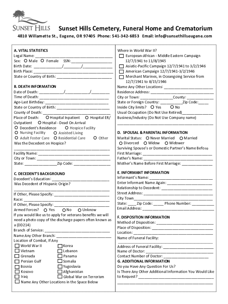 To fill out Sunset Hills Funeral Home, you will need to provide information about the deceased, the service details, and payment information.