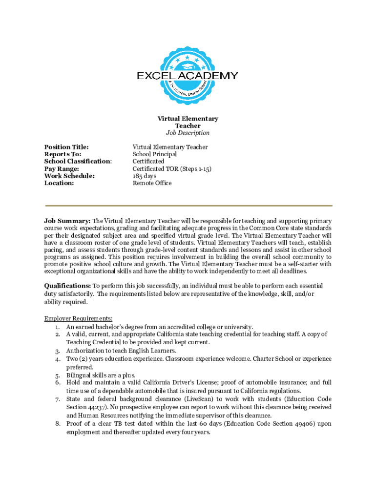 Get the free Virtual Elementary Teacher Job Description Position Title