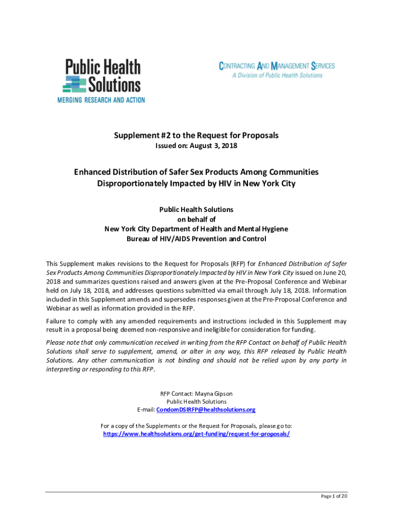 Supplement #2 to the Request for Proposals Issued on: August 3, 2018Enhanced Distribution of Safer Sex Products Among Communities Disproportionately Impacted by HIV in New York City Public Health