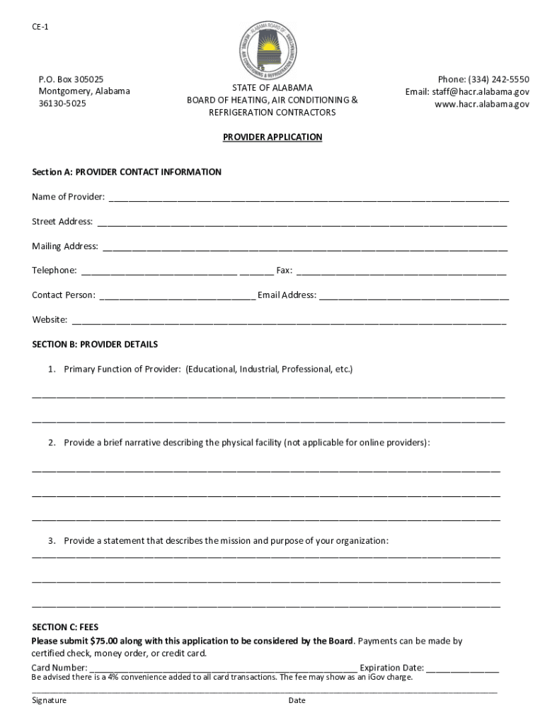 CE1P. O. Box 305025 Montgomery, Alabama 361305025STATE OF ALABAMA BOARD OF HEATING, AIR CONDITIONING & REFRIGERATION CONTRACTORSPhone: (334) 2425550 Email: staff@hacr.alabama.gov www.hacr.alabama.govPROVIDER