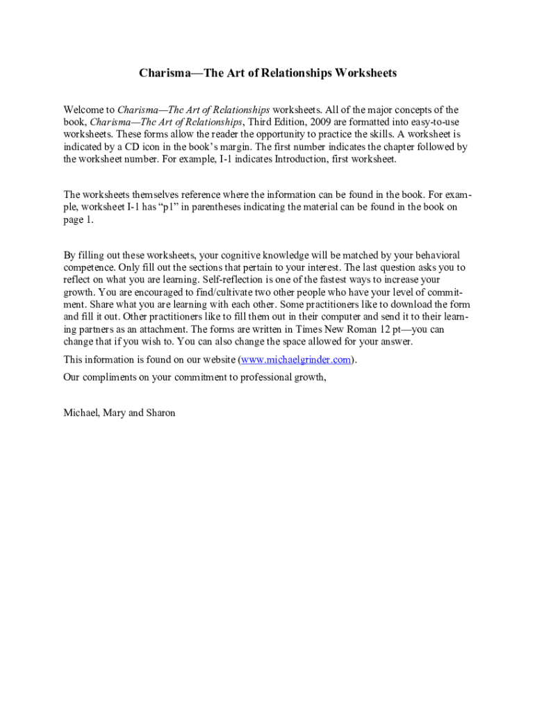 Charismatic Art of Relationships Worksheets Welcome to Charismatic Art of Relationships worksheets. All the major concepts of the book, Charismatic Art of Relationships, Third Edition, 2009 are formatted