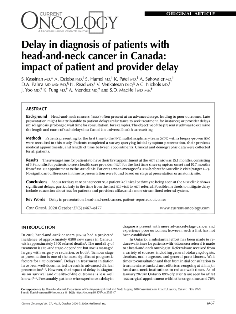 ORIGINAL ARTICLEDelay in diagnosis of patients with headandneck cancer in Canada: impact of patient and provider delay S. Assyrian MD, * A. Disobey PhD, S. Camel MD, K. Patel MD, A. Shoveled MD, D.A.