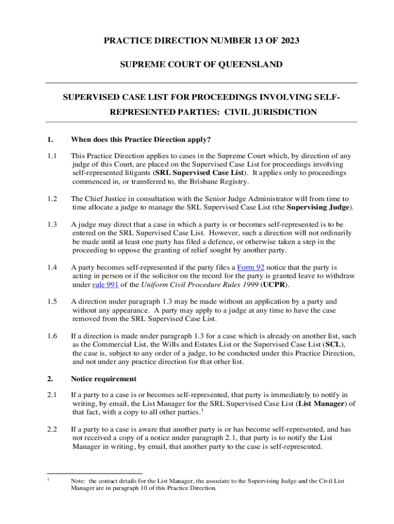 PRACTICE DIRECTION NUMBER 13 OF 2023 SUPREME COURT OF QUEENSLANDSUPERVISED CASE LIST FOR PROCEEDINGS INVOLVING SELFREPRESENTED PARTIES: CIVIL JURISDICTION 1. When does this Practice Direction apply?1.1This