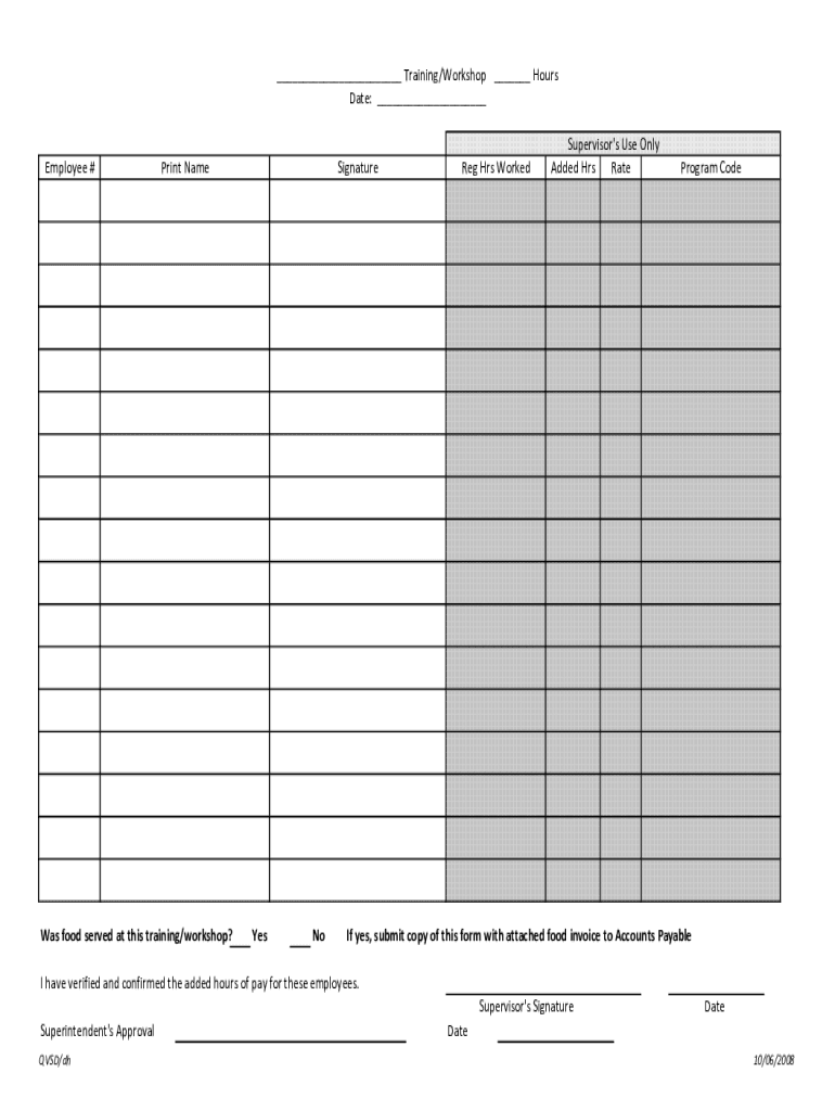Date: ___Employee #Print Names food served at this training/workshop? SignatureYesNoReg Hrs WorkedSupervisor\'s Use Only