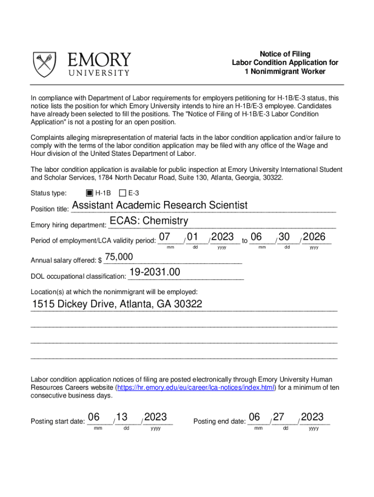 Get the free Notice of Filing Labor Condition Application for H-1B ... - ISSO - hr emory