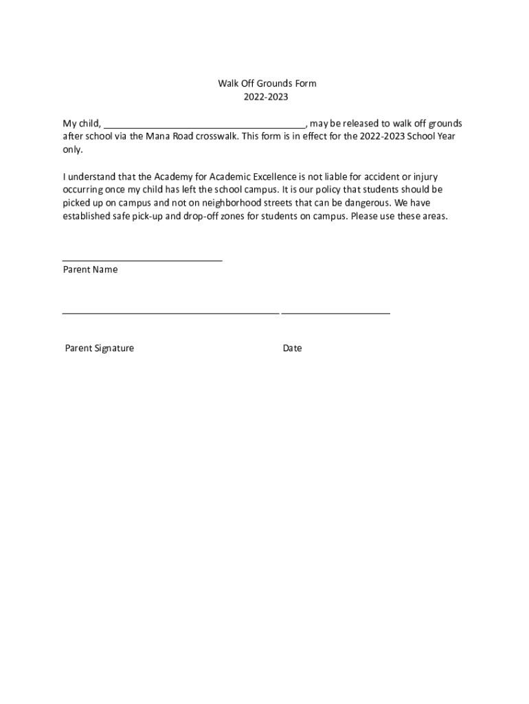Walk Off Grounds Form 20222023 My child, ___, may be released to walk off grounds after school via the MANA Road crosswalk. This form is in effect for the 20222023 School Year only. I understand that