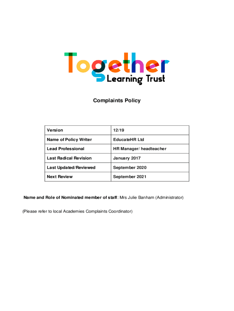 Complaints PolicyVersion12/19Name of Policy WriterEducateHR Ladled Professional HR Manager/ headteachers Radical Revision January 2017Last Updated/Reviewed September 2020Next Review September 2021Name