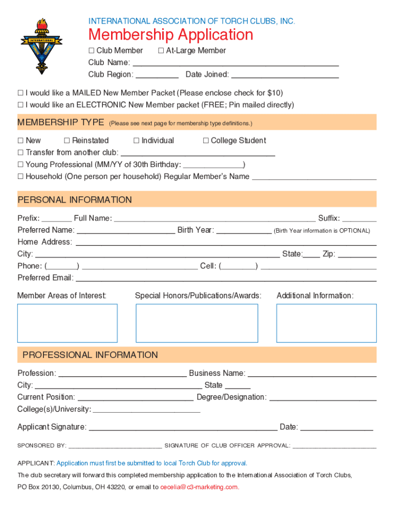 INTERNATIONAL ASSOCIATION OF TORCH CLUBS, INC. Membership Application Club Member Large MemberClub Name: ___ Club Region: ___ Date Joined: ___ I would like a MAILED New Member Packet (Please enclose