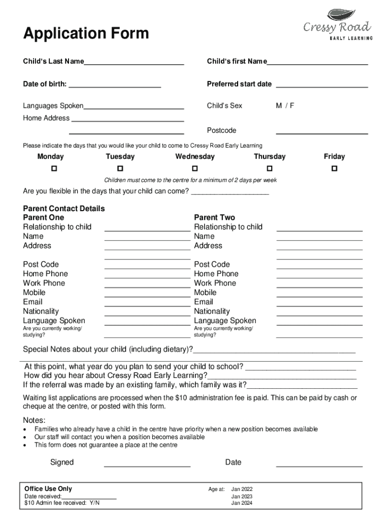 Application Form Child's Last NameChilds first Name Date of birth:Preferred start metalanguages SpokenChilds Seem /Home Address Postcode Please indicate the days that you would like your child to