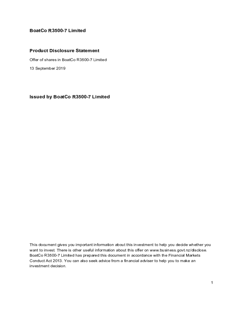Boat Co R35007 LimitedProduct Disclosure Statement Offer of shares in Boat Co R35007 Limited 13 September 2019Issued by Boat Co R35007 LimitedThis document gives you important information about this