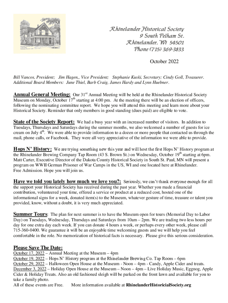 October 2022 Bill Van cos, President; Jim Hagen, Vice President; Stephanie Ski, Secretary; Cindy Goal, Treasurer. Additional Board Members: June Thiel, Barb Craig, James Hardy and Lynn Huber. Annual