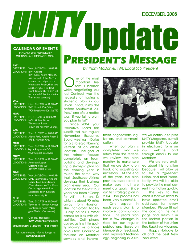 DECEMBER 2008UNITY Update CALENDAR OF EVENTS JANUARY 2009 MEMBERSHIP MEETING ALL TIMES ARE LOCAL BWI DATE/TIME: Wed., 01/21/09 at 10:00 AM LOCATION: BWI Airport BWI Cone. Room NOTE 247 (At the end