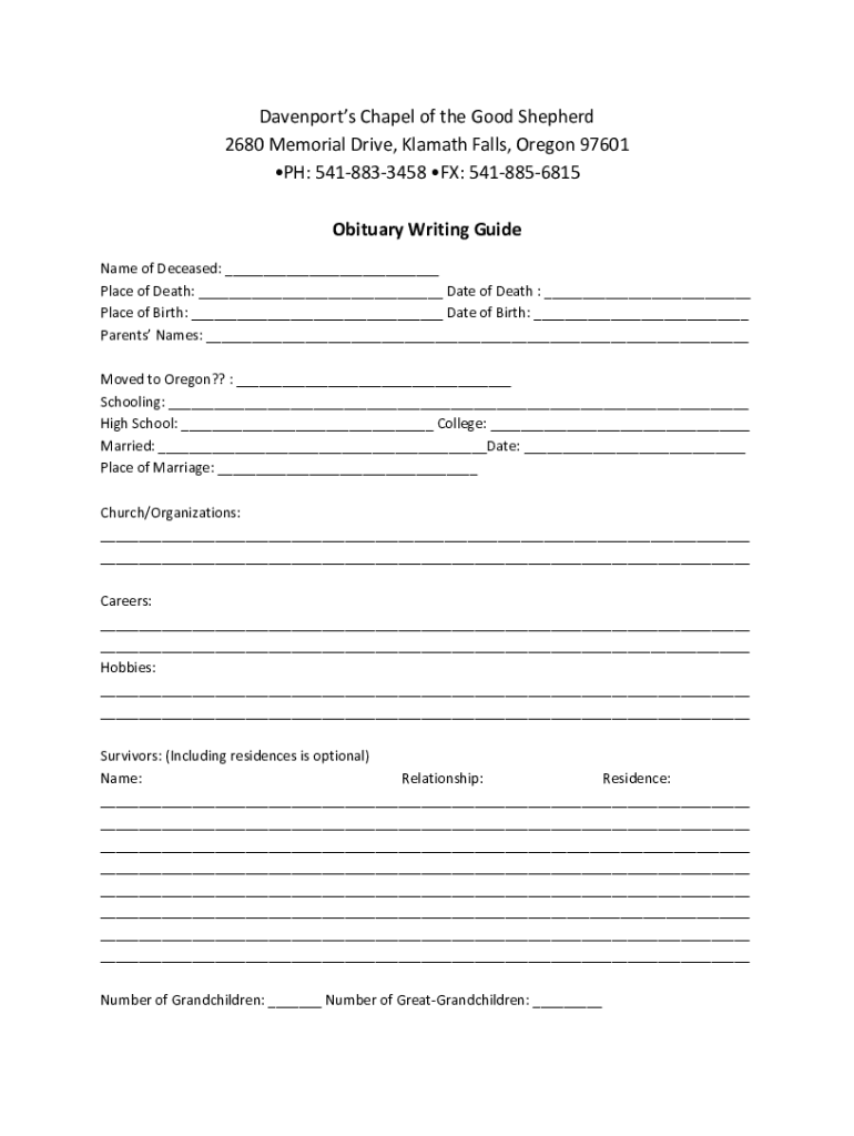 Davenports Chapel of the Good Shepherd 2680 Memorial Drive, Klamath Falls, Oregon 97601 PH: 5418833458 FX: 5418856815 Obituary Writing Guide Name of Deceased: ___ Place of Death: ___ Date of Death