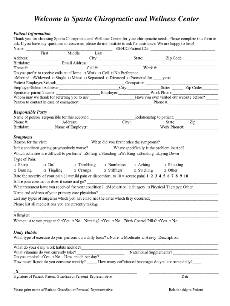 Welcome to Sparta Chiropractic and Wellness Center Patient InformationThank you for choosing Sparta Chiropractic and Wellness Center for your chiropractic needs. Please complete this form in ink.