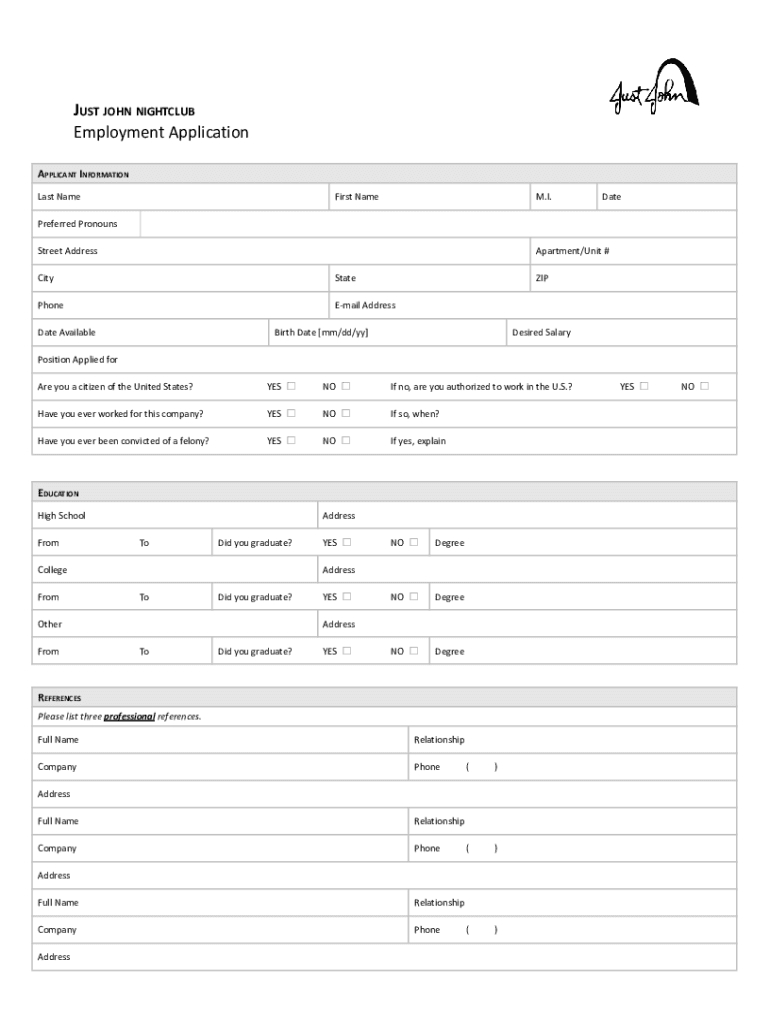 Get the free JUST JOHN NIGHTCLUB Employment Application