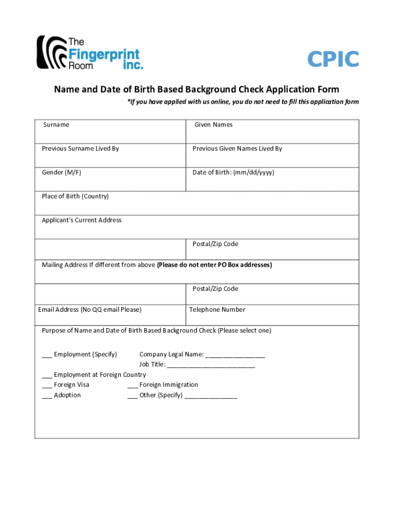 Name and Date of Birth Based Background Check Application Form *If you have applied with us online, you do not need to fill this application form SurnameGiven NamesPrevious Surname Lived Previous