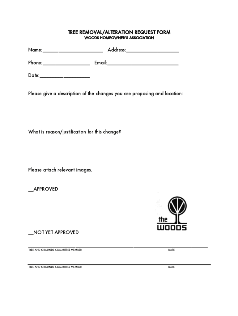 TREE REMOVAL/ALTERATION REQUEST FORM WOODS HOMEOWNERS ASSOCIATIONName:___ Address:___ Phone:___ Email:___ Date:___Please give a description of the changes you are proposing and location:What is reason/justification