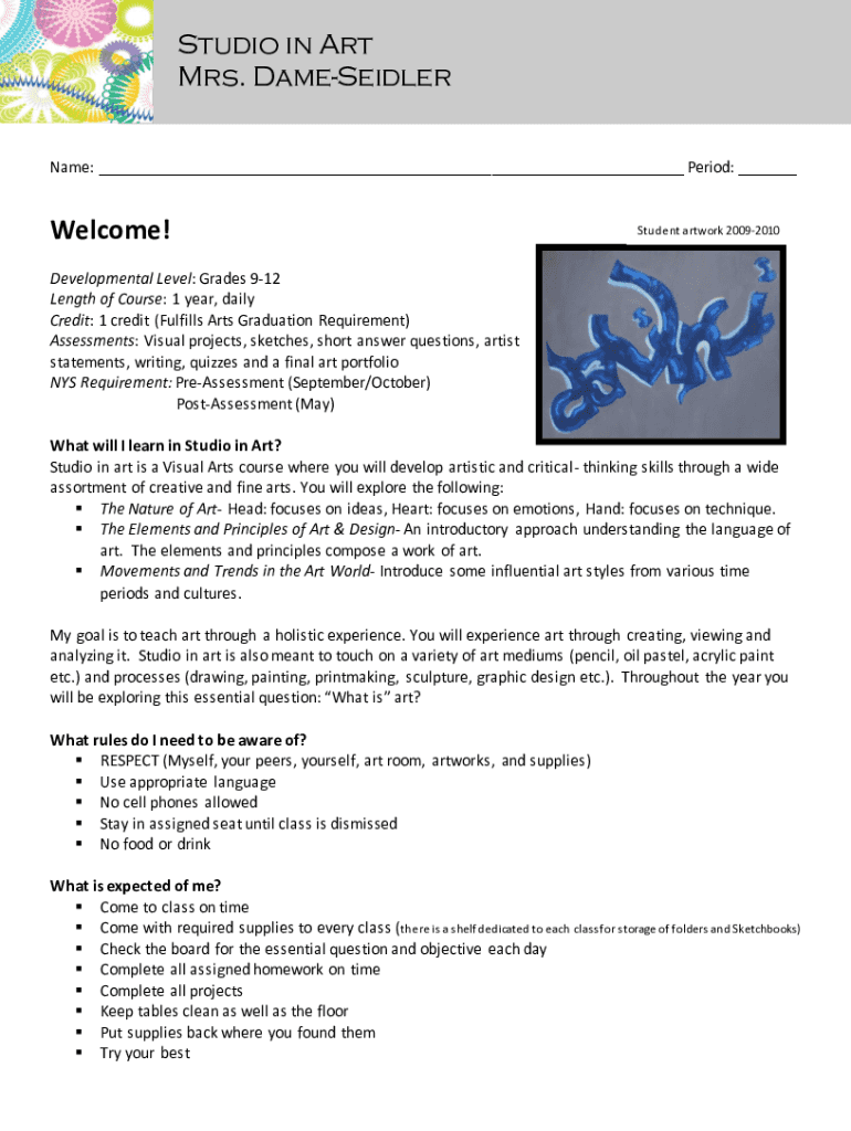 Studio in Art Mrs. DameSeidlerName: ___ Period: ___Welcome! Student an artwork 20092010Developmental Level: Grades 912 Length of Course: 1 year, daily Credit: 1 credit (Fulfills Arts Graduation Requirement)