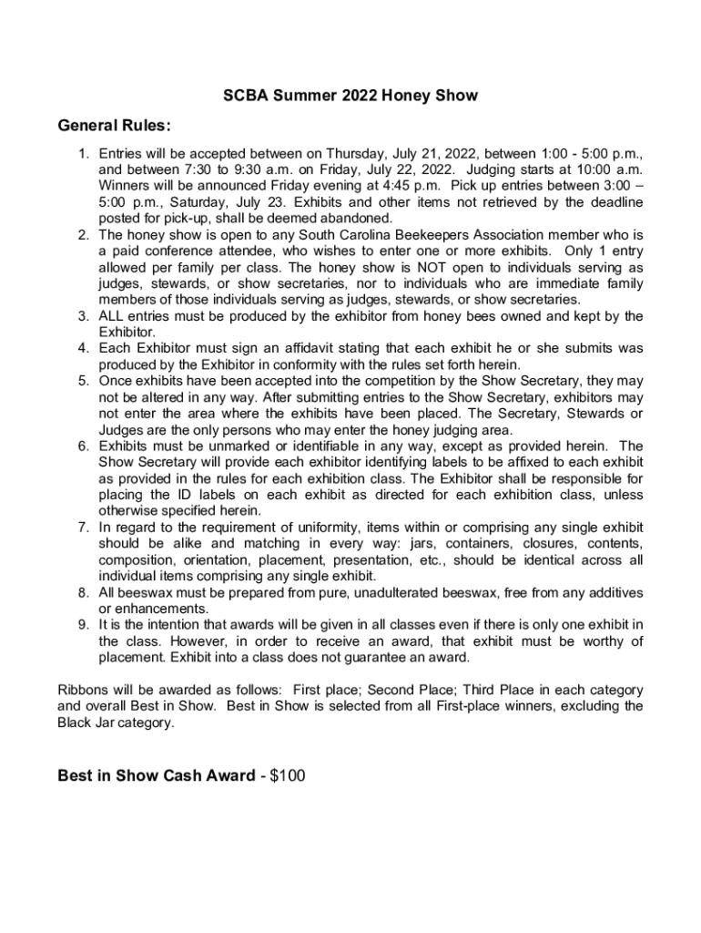 CBA Summer 2022 Honey Show General Rules: 1. Entries will be accepted between on Thursday, July 21, 2022, between 1:00 5:00 p.m., and between 7:30 to 9:30 a.m. on Friday, July 22, 2022. Judging starts