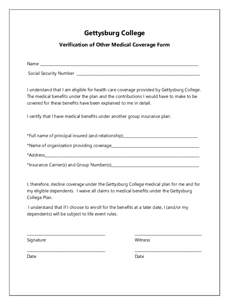 Gettysburg College Verification of Other Medical Coverage Form Name ___ Social Security Number ___ I understand that I am eligible for health care coverage provided by Gettysburg College. The medical