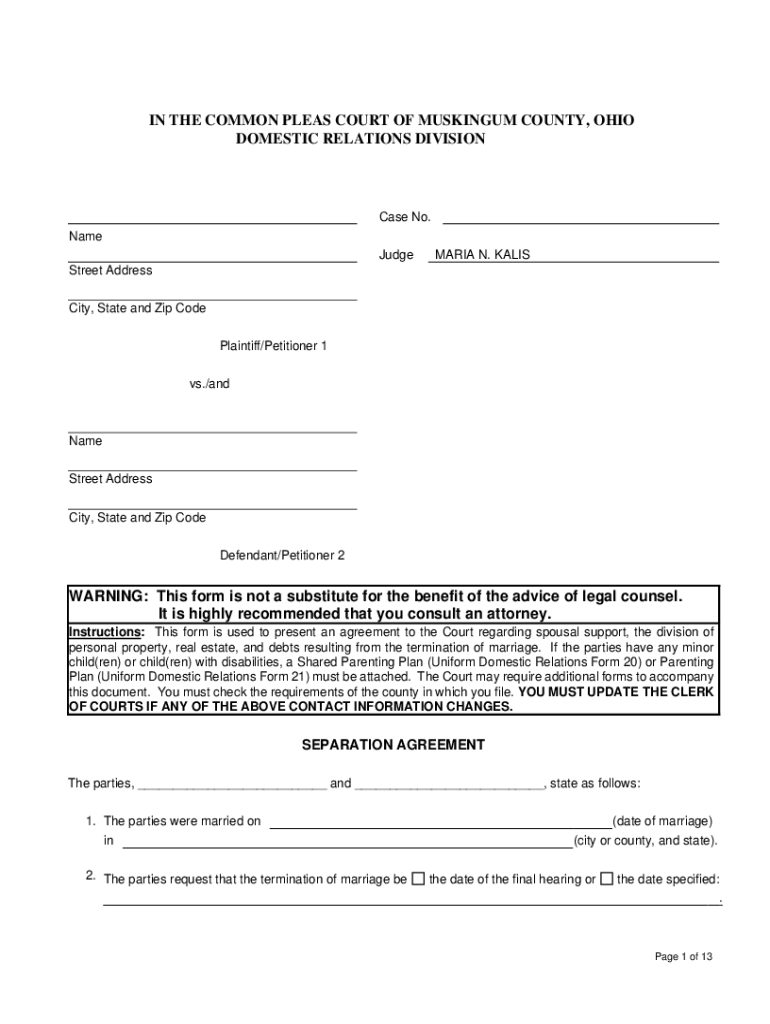 IN THE COMMON PLEAS COURT OF MASKING COUNTY, OHIO DOMESTIC RELATIONS DIVISION Case No. Name JudgeMARIA N. KALISStreet Address City, State and Zip Code Plaintiff/Petitioner 1 vs./endgame Street Address